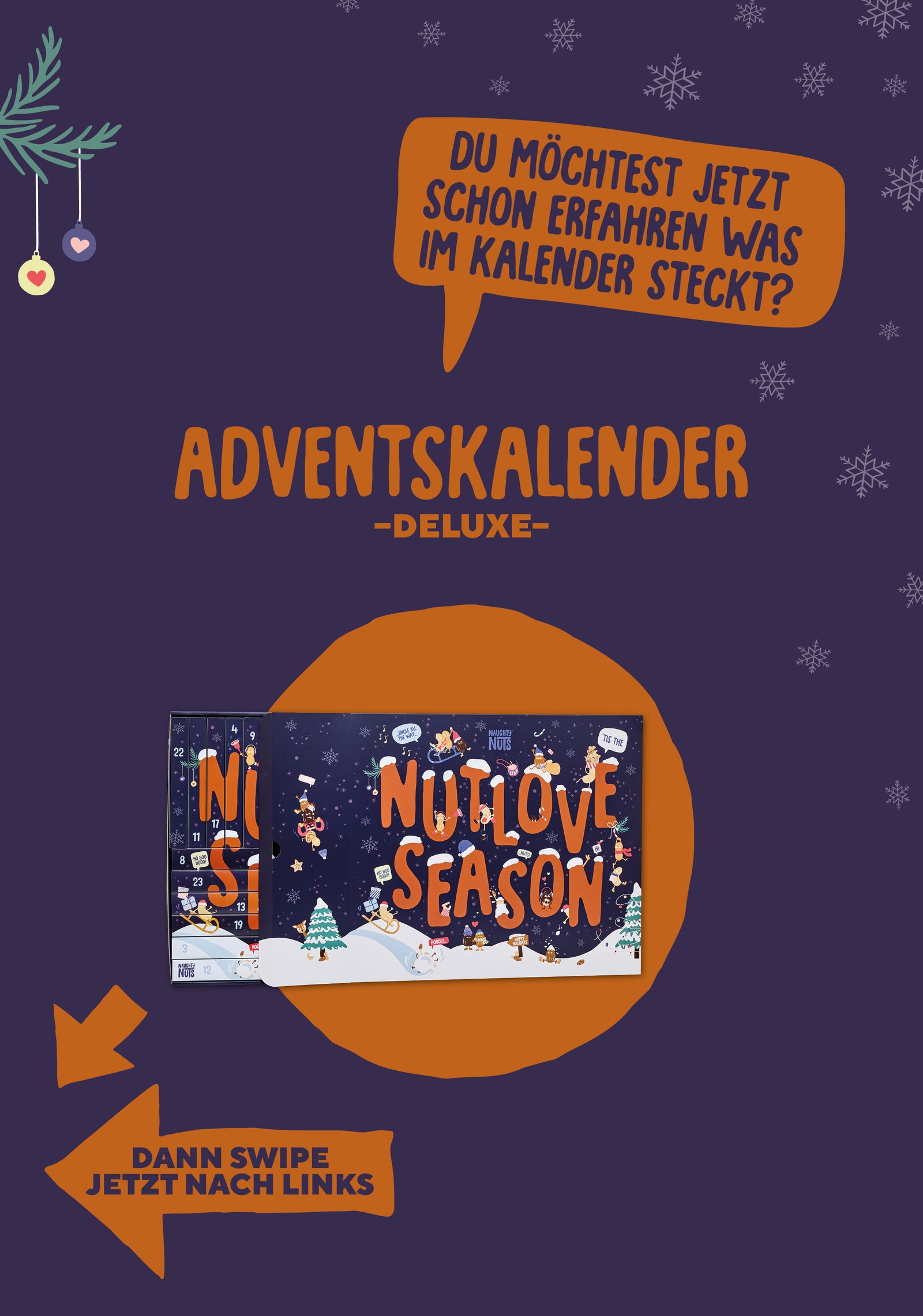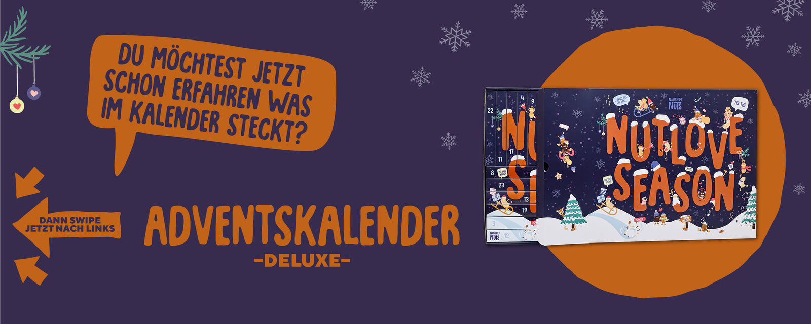 Der Classic ist unser reiner Snack-Kalender mit 24 abwechslungsreichen Produkten. Der Deluxe enthält u.a. 6 Nussmuse & Aufstriche in Originalgröße, brandneue Produkte und einen Naughty Nuts Gutschein im Wert von bis zu 100 €.